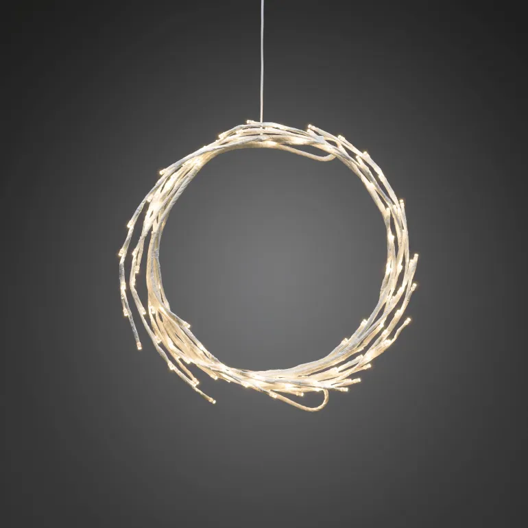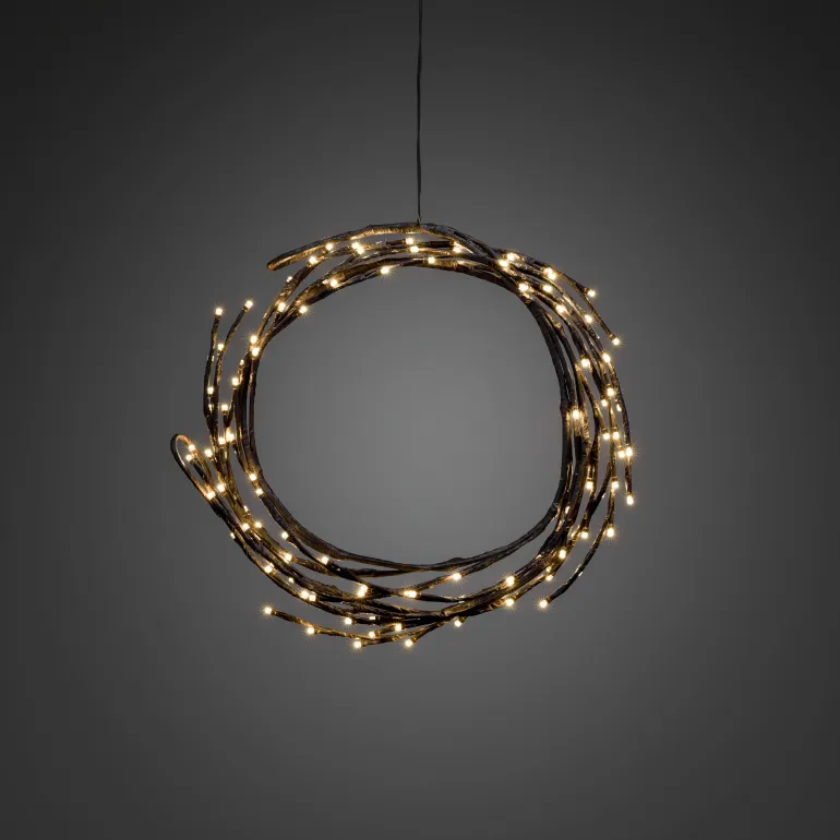 Konstsmide 3367-600 on ruskea valokranssi, jossa on 120 lämpimän valkoista LEDiä. 24 V/IP44.