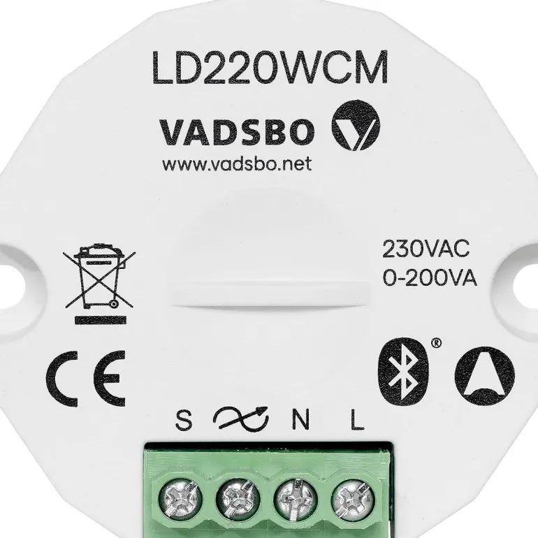LED-himmennin 0–200VA. 230 V LEDille, himmennettäville LED-toimilaitteille, 230 V halogeenille, tavalliselle hehkulampulle ja elektroniselle muuntajalle. Ohjataan pushilla ja/tai sovelluksella Bluetoothin kautta. Rasiaan mukautettu kompakti muotoilu. Sisäänrakennettu aikaohjaus ja astrotoiminto sovelluksen kautta. Valoskenaariot sovelluksen kautta Ohjelmoitava kytkin sovelluksen kautta. Ryhmitä ja synkronoi useita himmentimiä sovelluksen kautta. Helppo ohjelmistopäivitys himmentimessä. 30 metrin kantoetäisyys sisätiloissa yksiköiden välillä. MESH-teknologia laajentaa kantoetäisyyttä. Kiinnityskorvakkeet ja tukevat ruuviliittimet.