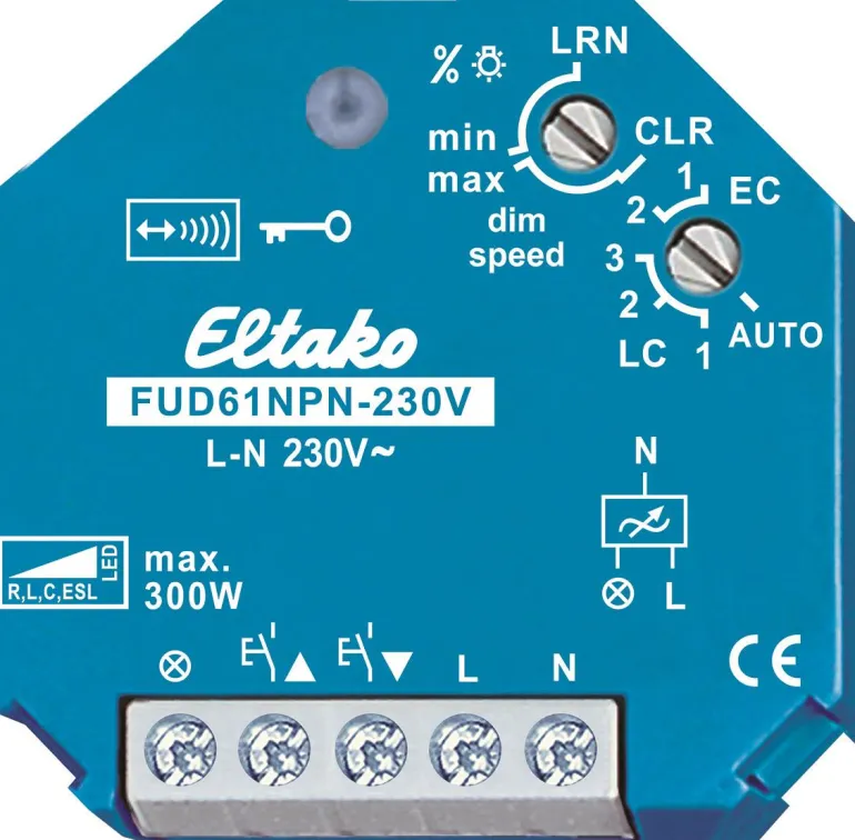 Yleisrasiahimmennin, jossa on nollajohtimen (N) tarve, R, C, L + ESL + LED-kuormituksille. Valmiustilan kulutus vain 0,6 wattia. Kaksisuuntaisella ja vahvistintoiminnolla. Vähimmäisvalotaso ja himmennysnopeus voidaan säätää. Valoherätyskellolla, lastenhuonetoiminnolla ja nukahdustoiminnolla. Enintään neljä valoskenaariota voidaan ohjelmoida painikkeella, jossa on kaksoiskytkimet. Automaattinen elektroninen ylikuormitus- ja lämpötilasuojaus. Säädetty valotaso tallennetaan sammutettaessa. Pehmeä ON ja OFF-toiminto kuorman säästämiseksi. Kiekkoa voidaan ohjata eri lähettimillä. Sitä voidaan ohjata myös jousikuormitteisilla kytkimillä. Vähimmäiskuormaa ei tarvita. Kuormitus: R = Vastuskuormitus /230V Hehkulamput – Halogeenilamput 0–300W C = Kapasitiivinen kuormitus /Elektroniset muuntajat 0–300W L = Induktiivinen kuormitus/Perinteiset muuntajat 0–300W (maks. 2 kpl) ESL = Himmennettävät matalaenergialamput 0–100W LED = Himmennettävät 230V LED-lamput 0–100W. Himmennin vaatii nollajohdon.