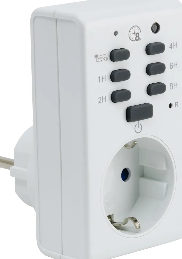 Kannettava valorele ajastimella. Kytkentä tavalliseen 230 V:n pistorasiaan. Sopii hehkulampuille, LED-lampuille ja energiansäästölampuille. Valorele tunnistaa ympäristön valotason ja kytkee liitetyt valot päälle automaattisesti iltaisin heti, kun asetettu hämärätaso on saavutettu, ja sammuttaa valot vastaavasti päivänvalossa. Energiaa säästävä, ihanteellinen ratkaisu kotiin. Soveltuu esimerkiksi jouluvalaistukseen. Valoreleessä on satunnaisvalintatoiminto (päälle/pois päältä). Helppo ohjelmointi. Kosketussuojattu pistorasia. 230 V. Hyväksyntä: 16 A, 1800 W resistiivisellä kuormalla.