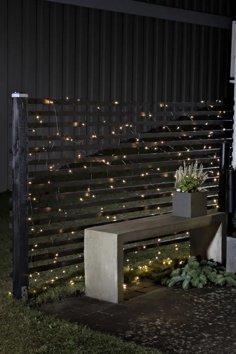 Konstsmide 3723-130 on valosarja (valoverkko), jossa on 40 lämpimän valkoista LEDiä (huurrettu). Mitat 80×80 cm. Sensori/ajastin, 6/9 h.