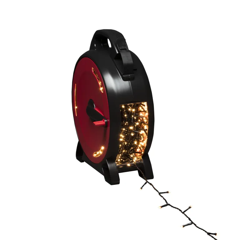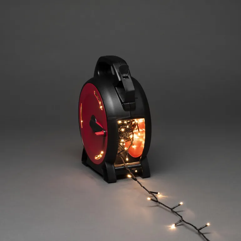 Konstsmide 3834-107 on valosarja kelalla, jossa on 400 lämpimän valkoista LEDiä. Musta pehmeä johto, 30V/IP44.