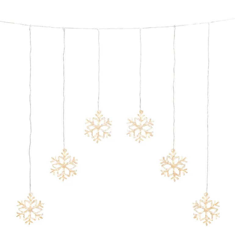 Konstsmide 4044-103 on valosarja, jossa on 6 lumihiutaletta (48 lämpimän valkoista LEDiä). 24V/IP44. Leveys 90 cm.