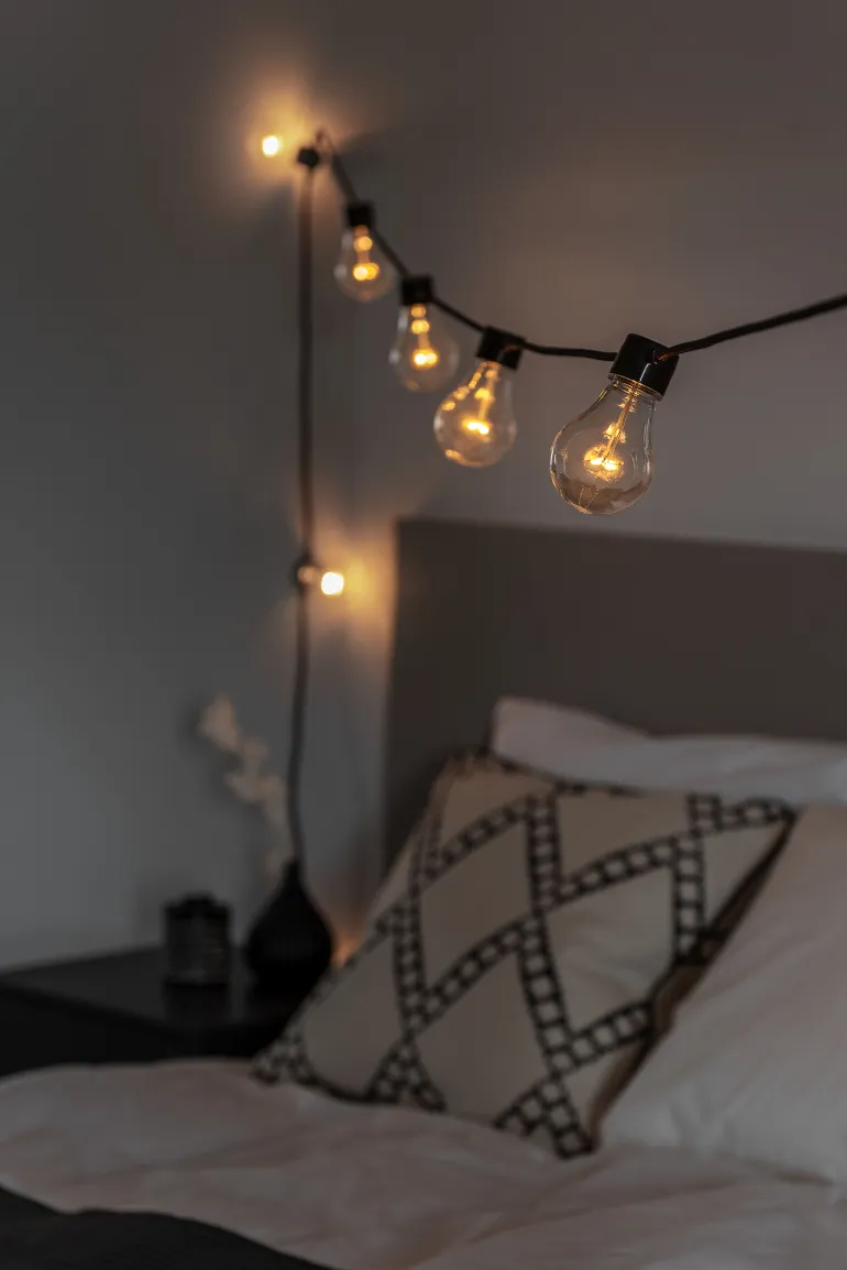 Konstsmide 2382-700 on valosarja, jossa on 10 LEDiä (E27, valon väri amber). Musta tekstiilinen johto.