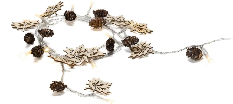 Konstsmide 3218-103 on valosarja, jossa 10 puista käpyä. Lämmin valkoinen LED. 3xAA. Ajastin 6 h.