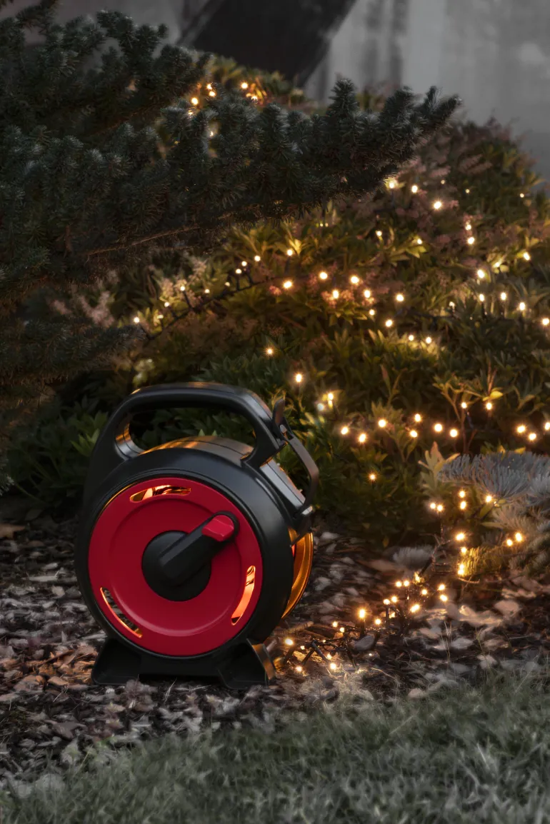 Konstsmide 3843-100 on valosarja kelalla, jossa on 300 lämpimän valkoista LEDiä (cluster). Musta johto, 30V/IP44.