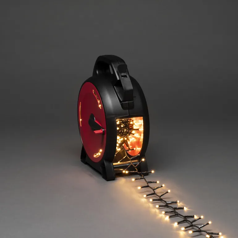 Konstsmide 3843-100 on valosarja kelalla, jossa on 300 lämpimän valkoista LEDiä (cluster). Musta johto.