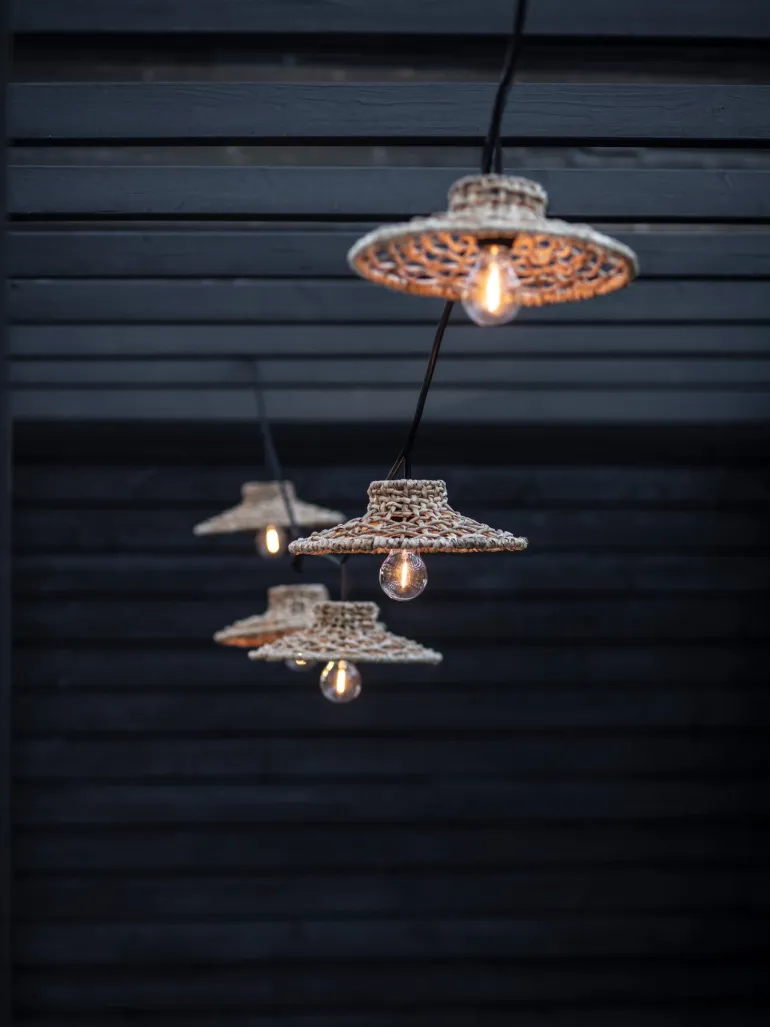 Flex Out -valosarja (IP44) 5 lampunpitimellä ja varjostimella. Kokonaispituus 6,5 m, 2,5 m ensimmäiseen lampunpitimeen, sitten 80 cm kunkin lampunpitimen välillä. Etäisyys alas varjostimeen 15 cm. 5 kpl Sari -varjostimia (luonnonväri). Varjostimien leveys 29 cm ja korkeus 9 cm.