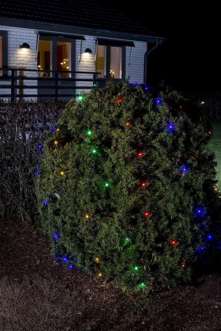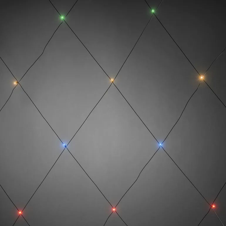 Konstsmide 3749-500 on valoverkko, jossa on 64 LEDiä eri väreissä. 2×2 m, musta verkko/johto.
