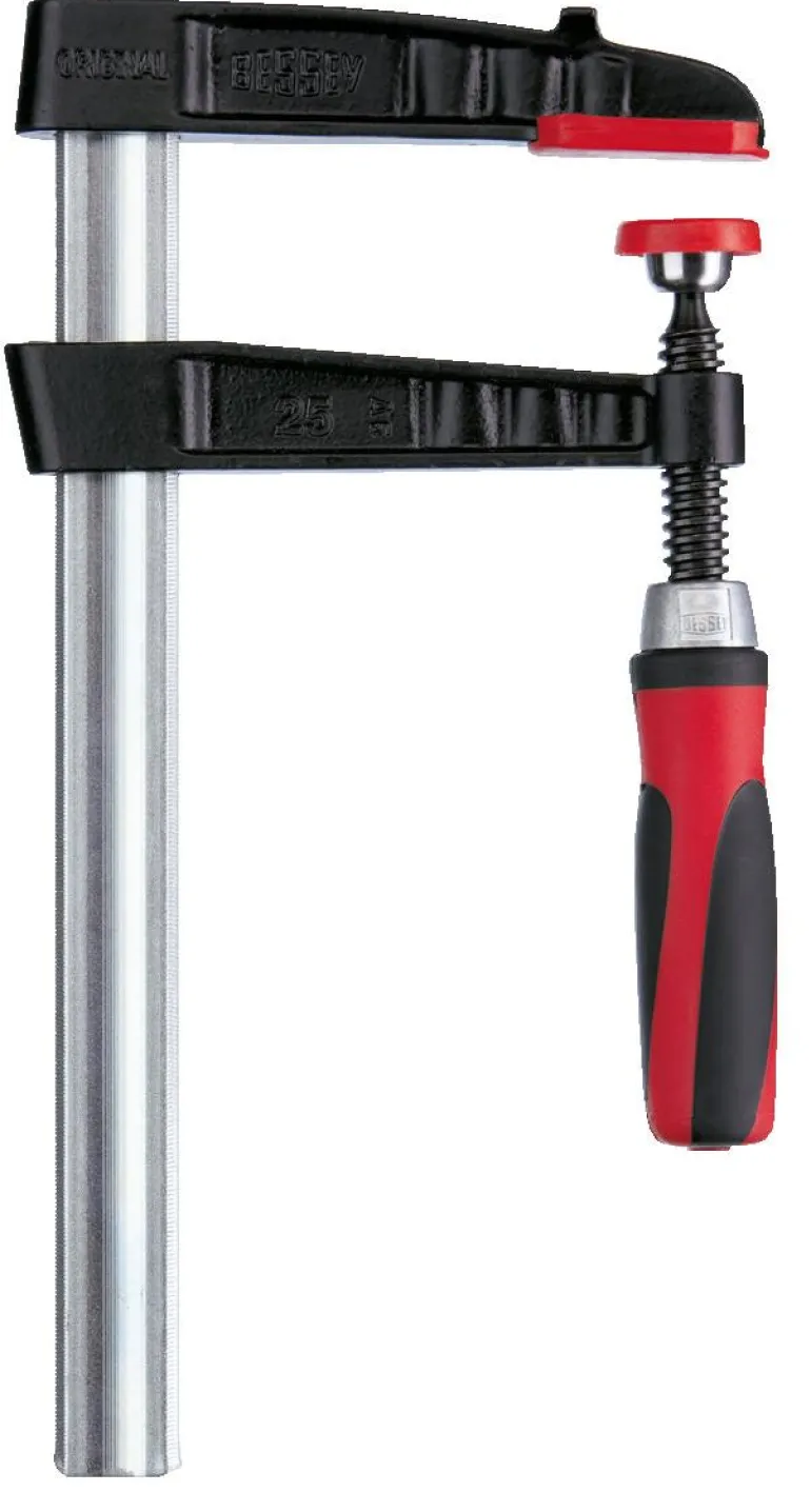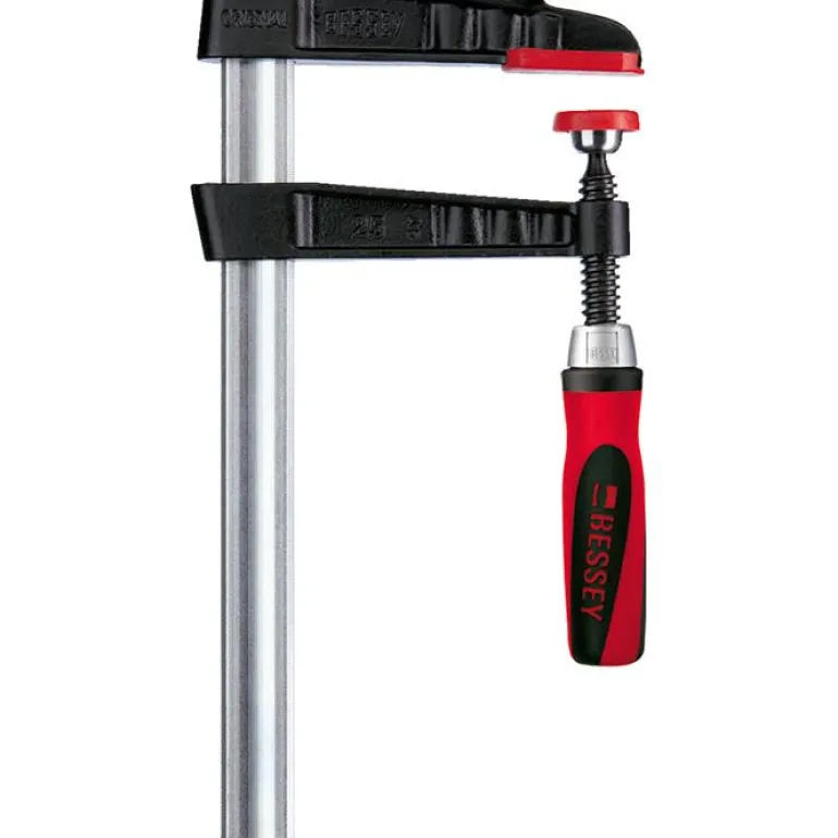 Bessey TG125-2K -valurautapuristin, aukkoväli 250 mm ja syvyys 120 mm. Tempervalurautainen TG-puristin, kahva kaksikomponenttimateriaalia. Profiloitu kisko ja pysäytysruuvi, jotta puristin ei lipeä otteesta.