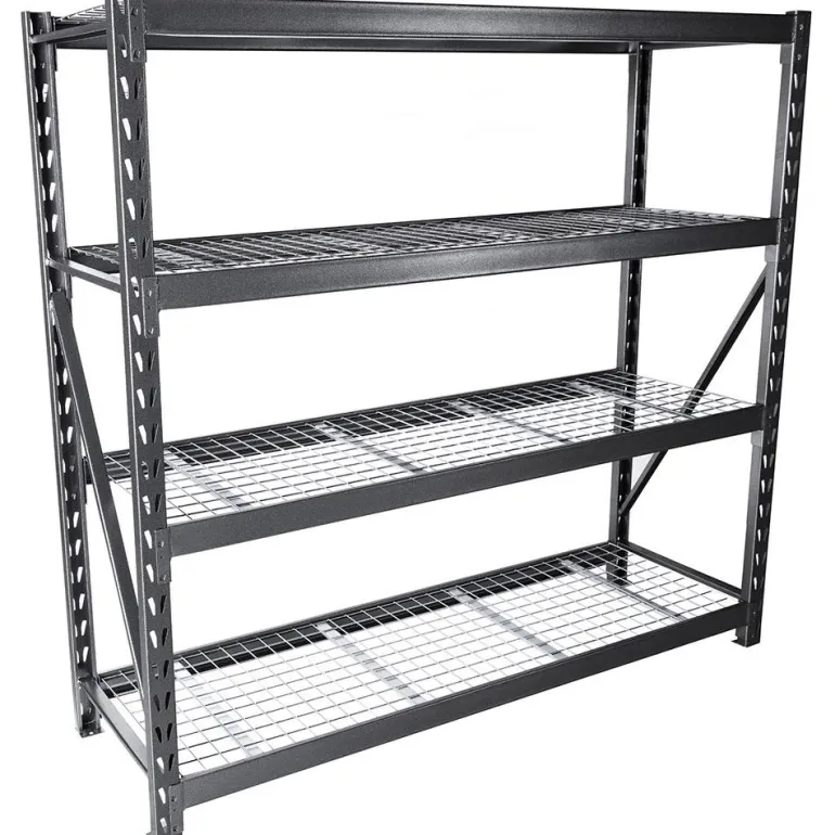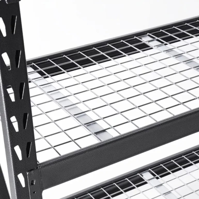 Varastohylly, jossa on 4 hyllytasoa kestävästä sähkösinkitystä ritilästä, joka kestää 500 kg:n kuormituksen hyllytasoa kohti.
