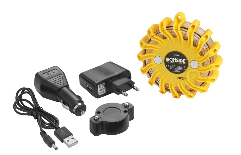 Varoitusvalo, jossa 16 valodiodia ja 9 valo-ohjelmaa. Valaisin on magneettikiinnitteinen, suojausluokka IP66. Ladattavalla akulla