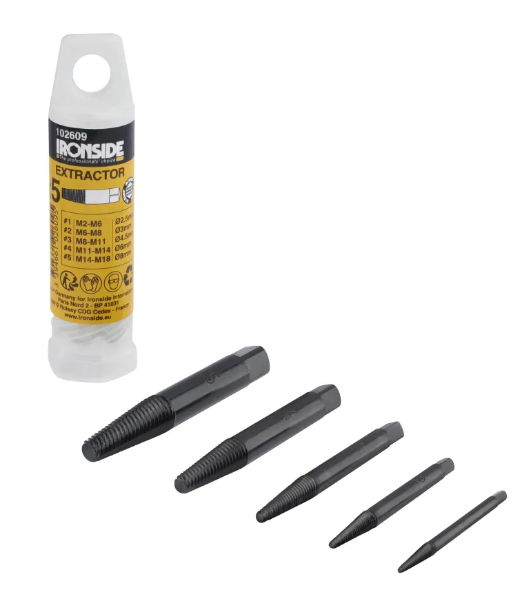 Sarjassa vasenkierteinen ruuvin ulosvetäjä. Toimitetaan pyöreässä muovikotelossa, jossa ripustin.