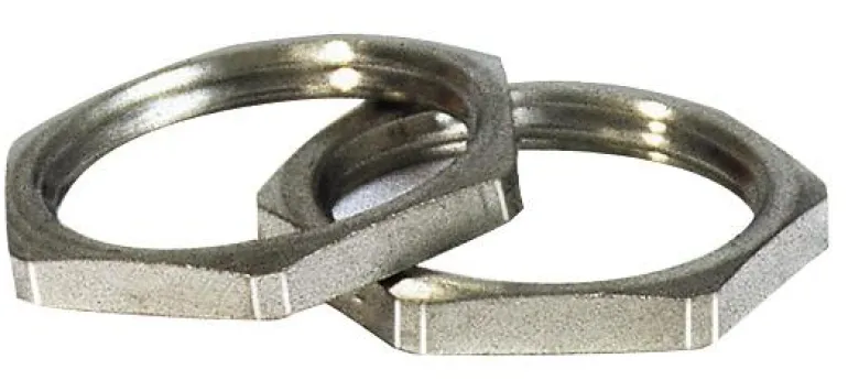 Nikkelöity messinkinen vastamutteri, DIN 46 320 -standardin mukainen.