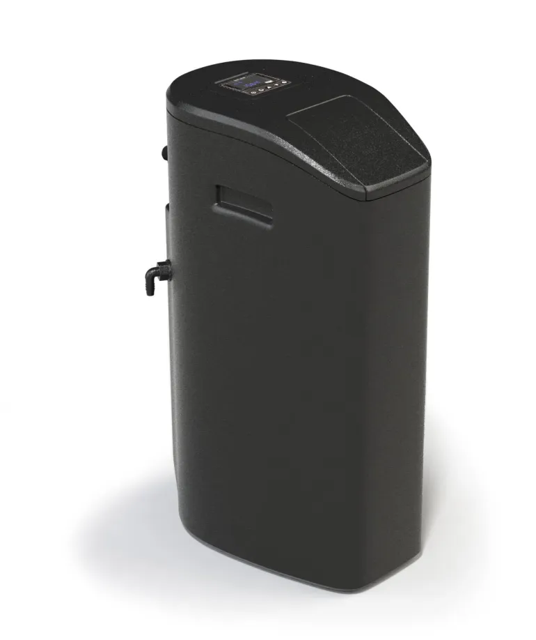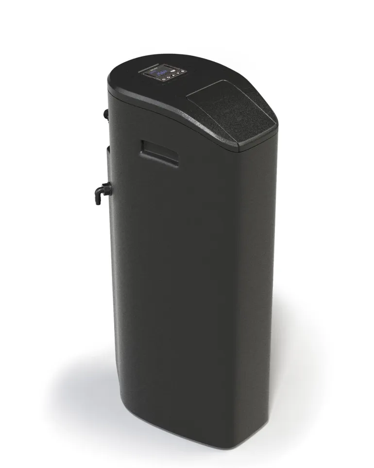 Tilavuusohjattu ja älykäs pehmennyssuodatin vesijohtovedelle kompaktissa muodossa ja integroidulla suolasäiliöllä. Musta, valmistettu komposiitista/monikerroksisesta materiaalista.
