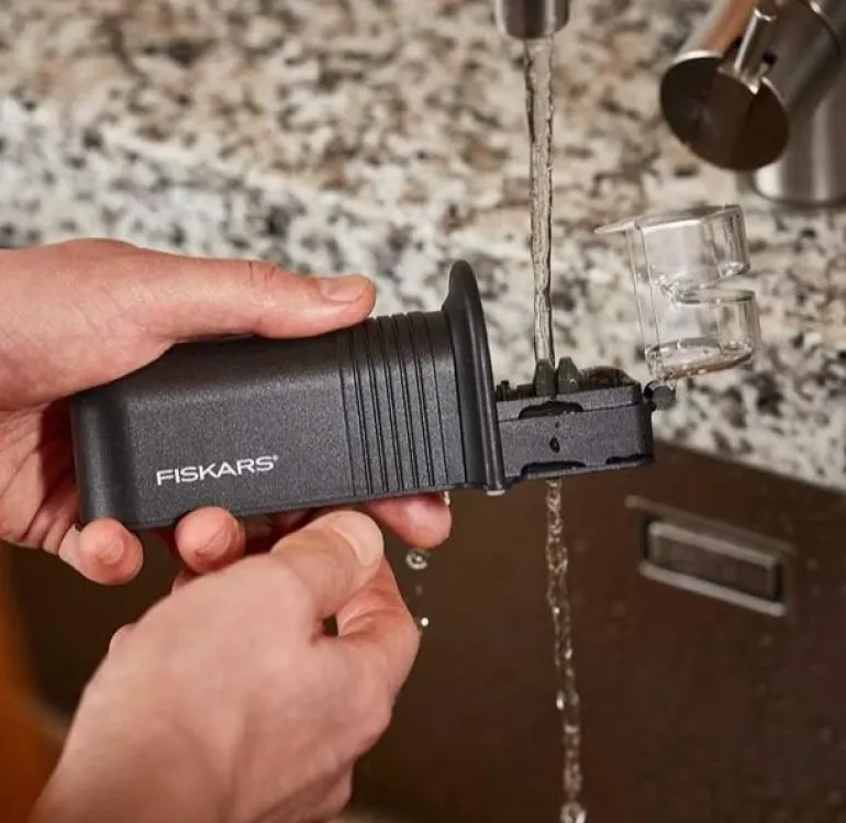Pieni ja tehokas veitsenteroitin, joka mahtuu helposti keittiön laatikkoon. Veitsenteroitin toimii ilman sähköä ja sopii sekä vasen- että oikeakätisille. Käytä Fiskarsin Roll-Sharp-veitsenteroitinta vähintään kerran kuukaudessa, jotta terät pysyvät terävinä pitkään.