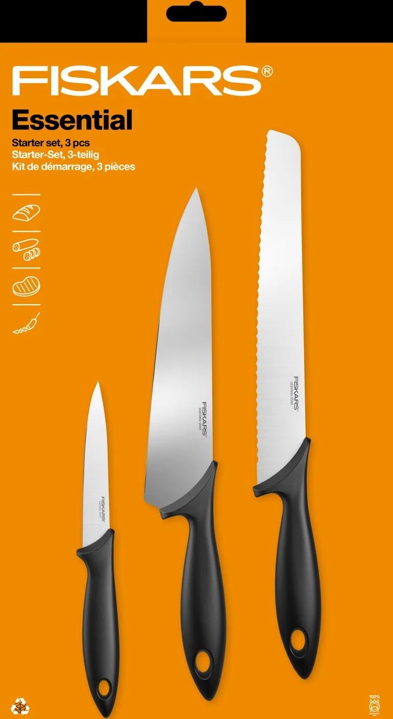 Fiskars Essential -veitsisetti sisältäen kolme veistä ruostumattomasta teräksestä. Setti sisältää leipä-, kokin- ja vihannesveitsen. Konepesunkestävät.