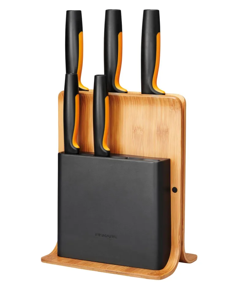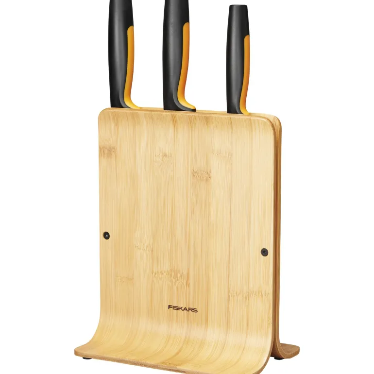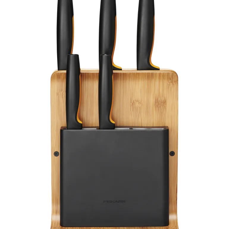 Bambusta ja muovista valmistettu veitsiteline, jossa on viisi yleisintä keittiöveistä. Veitsiteline on kompakti, pystyasennossa. Helppo ulottuvuus mahdollistaa sijoittamisen vaikka matalienkin yläkeittiökaappien alle.