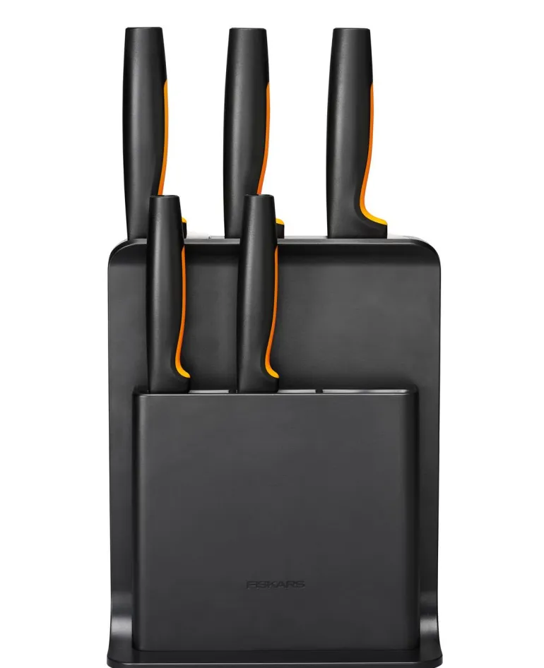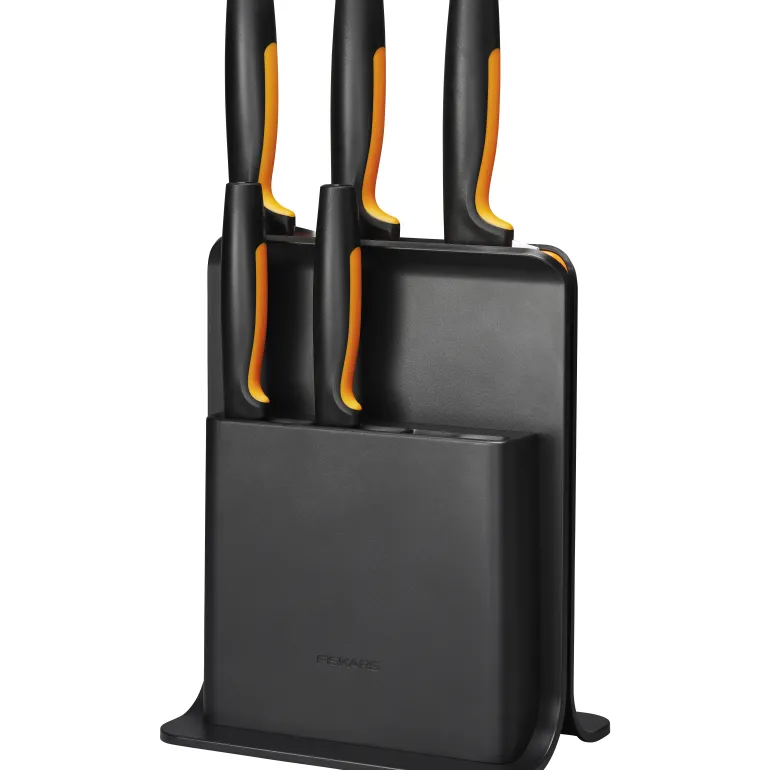 Muovinen veitsiteline, joissa on viisi yleisintä keittiöveistä. Veitsiteline on kompakti, pystyasennossa.