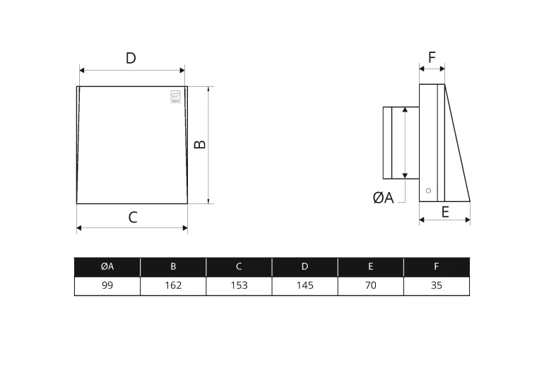 Venttiili, jonka mitat 153 x 165 mm, valmistettu valkoisesta ABS:stä. Suodattimella, kondensioeristys ja säätö portaattomaan ilmavirran säätöön.