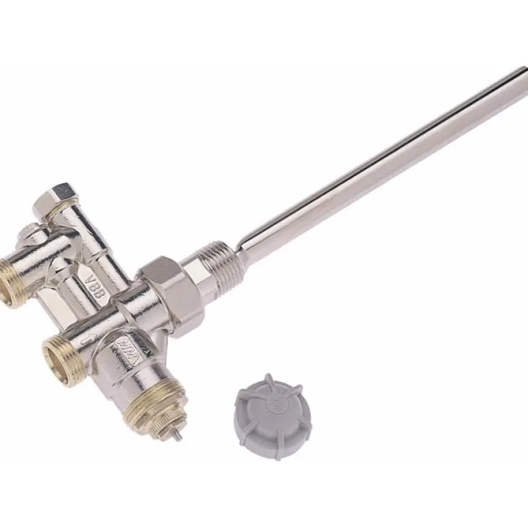 Venttiilipaketti/-liitin pyyhekuivaimeen, jossa on 1- tai 2-putkijärjestelmä (säädettävä). G15-ulkokierre ja jakoputki 400 mm, joka voidaan katkaista käytettäessä pieniä pyyhekuivaimia-