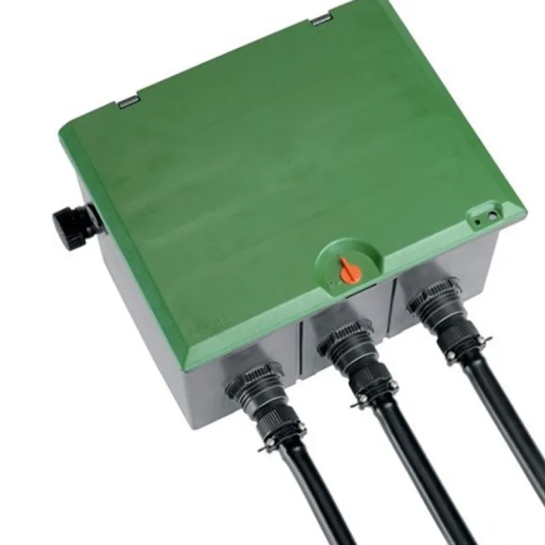 Venttiilirasia. Rasiaan voidaan asentaa kolme 24 V:n kasteluventtiiliä (tuote nro 1278-20) tai kolme 9 V:n kasteluventtiiliä (tuote nro 1251-20) maan alle. Vedensyöttömahdollisuus kolmelta puolelta.