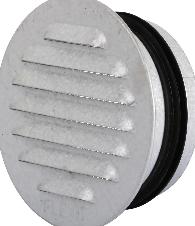 Venttiilisäleikkö, jossa on Ø100 mm kanavaan ja Ø 125 mm kanavaan sovitettu putkiyhde ja tiiviste. Hyönteisverkko haponkestävää terästä.