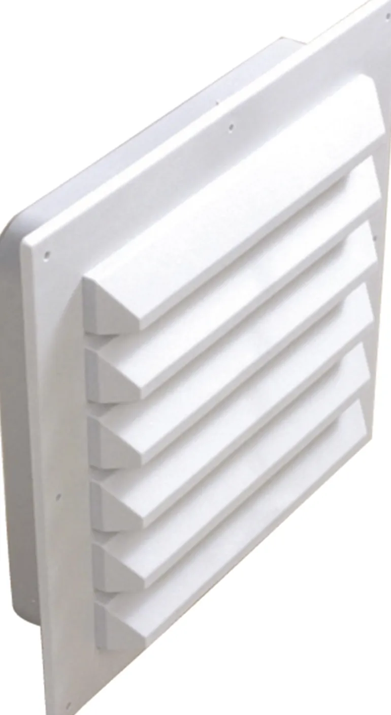Kiinteä venttiilisäleikkö, koko 153 x 153 mm. Säleikkö soveltuu kaikille seinätyypeille ja on erityisesti sovitettu teleskooppikanaville.