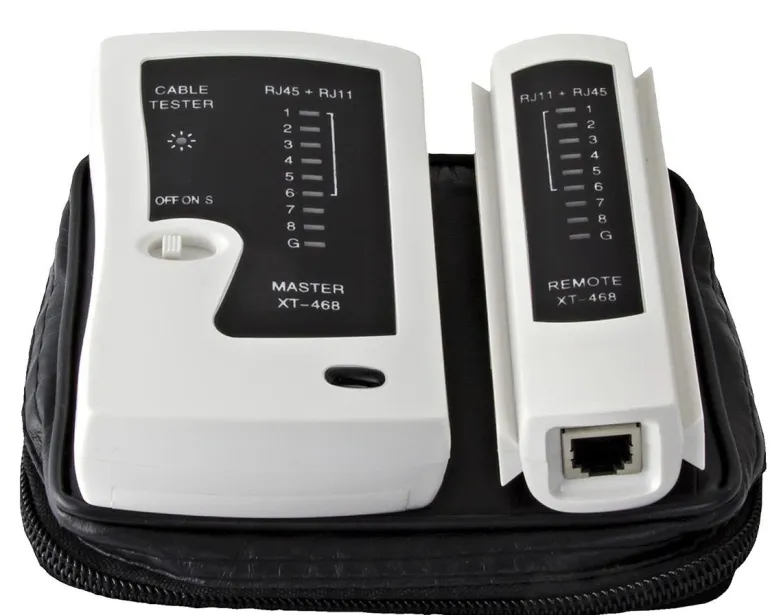 LED-merkkivalolla varustettu verkkotesteri, jota tulisi aina käyttää oikean asennuksen varmistamiseksi. Tällä kompaktilla laitteella voidaan testata RJ45-verkko- ja RJ11/12-puhelinkaapeleita sekä useimpia datakaapelityyppejä (CAT5/6 ja ISDN).