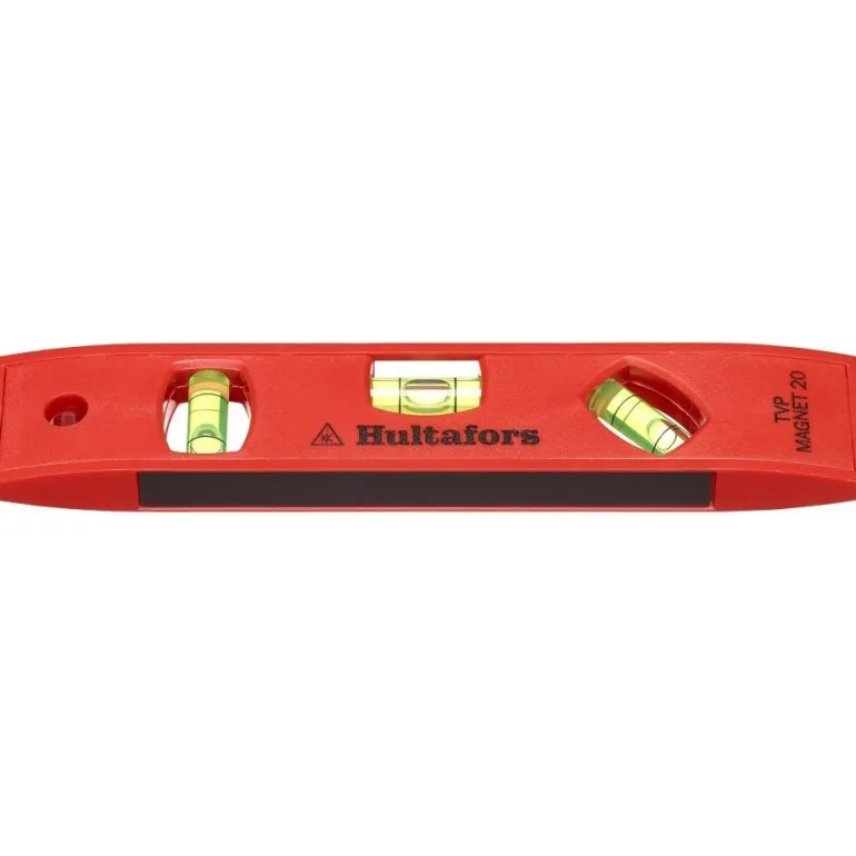 Hultafors TVP MAGNET 20 on Iskunkestävä 200 mm pitkä vesivaaka punaista ABS-muovia, alapuolella magneetit. Rikkoutumattomat putkilibellit ovat erittäin läpinäkyvät ja kestävät.