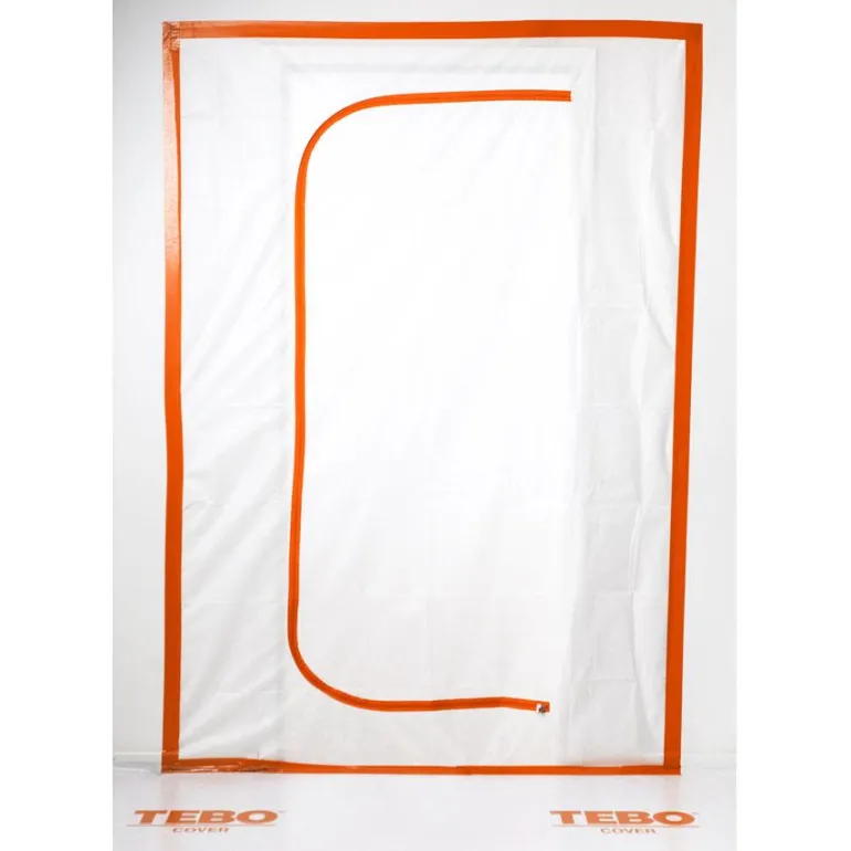 TEBO Cover 869634 on hengittävästä kuitukankaasta valmistettu vetoketjullinen ovi, jota käytetään suojana oviaukoissa esimerkiksi remontin aikana. C-malliset vetoketjut tekevät sen alareunasta tiiviin. Koska materiaali päästää ilman läpi, se soveltuu maalaamiseen ja muuhun vastaavaan. Ovi kiinnitetään teipillä.