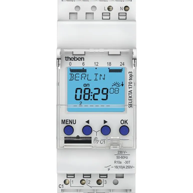 SELECTA 170 Top3:n minimikytkentäkapasiteetti on noin 10 mA. Asennetaan DIN-kiskoon. Varustettu LCD-näytöllä ja käyttöpainikkeella pistokkeen irrottamiseksi. Sijaintitiedot voidaan ohjelmoida koordinaattien tai maa-kaupunkiluettelon kautta ja huoltotoiminto mahdollistaa huoltovälien seurannan. Maksimaalinen suoja peukalointia vastaan, aikakytkentäohjelmat voidaan siirtää sovelluksesta kelloon vain Bluetooth-yhteyden avulla. Eri maiden siirtymäsäännöt on jo tallennettu. Omat siirtymäsäännöt tai vaihdot tehdään asetuksista.
