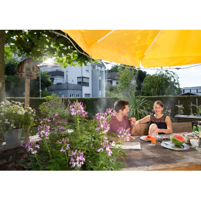 Viilennyssumusuutin tarjoaa virkistystä kuumina kesäpäivinä ja alentaa ympäröivän ilman lämpötilaa jopa 6° C. Erittäin hieno vesisuihku muodostaa ilmaan viileän sumuverhon. Sarja voidaan kiinnittää esim. terassille, pergolaan, auringonvarjon alle tai telttakatokseen. Sarja on helppo kiinnittää vesihanaan OGS-pikaliittimen avulla. Vesivirtaus 13 litraa/tunti.