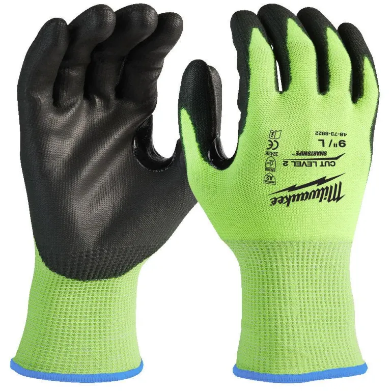 Milwaukee 4932479923 on High Visibility-käsine viiltosuojalla (taso 2/B), joka on valmistettu fluoresentista materiaalista erinomaista näkyvyyttä varten. Kevyet ja erikoisen ohuet käsineet PU-upotetulla kämmenellä, joka lisää sormituntumaa. Viiltosuojataso 2/B on erinomaisesti soveltuva materiaalin käsittelyyn, puutöihin, maalaamiseen ja kipsilevy- sekä kattoasennuksiin. Vahvistettu nitriilipäällyste antaa lisäsuojan peukalon ja sormien välille. Käsineessä on myös Smartswipe-kosketusominaisuus kämmenessä ja sormenpäissä, joka mahdollistaa kosketusnäyttöjen käytön käsineet päällä. EU-sertifioitu viiltosuojaus: EN ISO 21420 ja EN388:2016 (3242B).