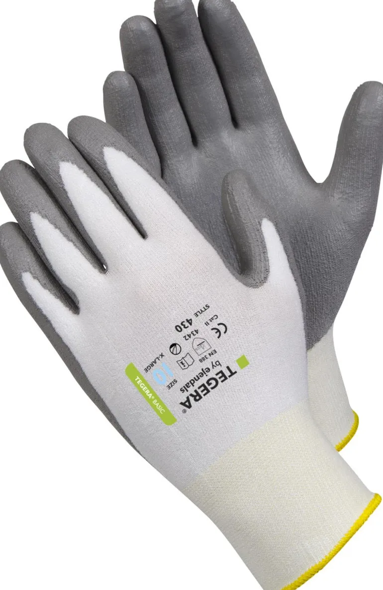 TEGERA® 430 on viiltosuojaluokan B työkäsineet monipuolisiin käyttökohteisiin. Hengittävä kämmenselkä ja kämmenessä harmaa tasainen PU-pinnoite, joka tarjoaa pitävän otteen kuivilla ja hieman kosteilla pinnoilla.