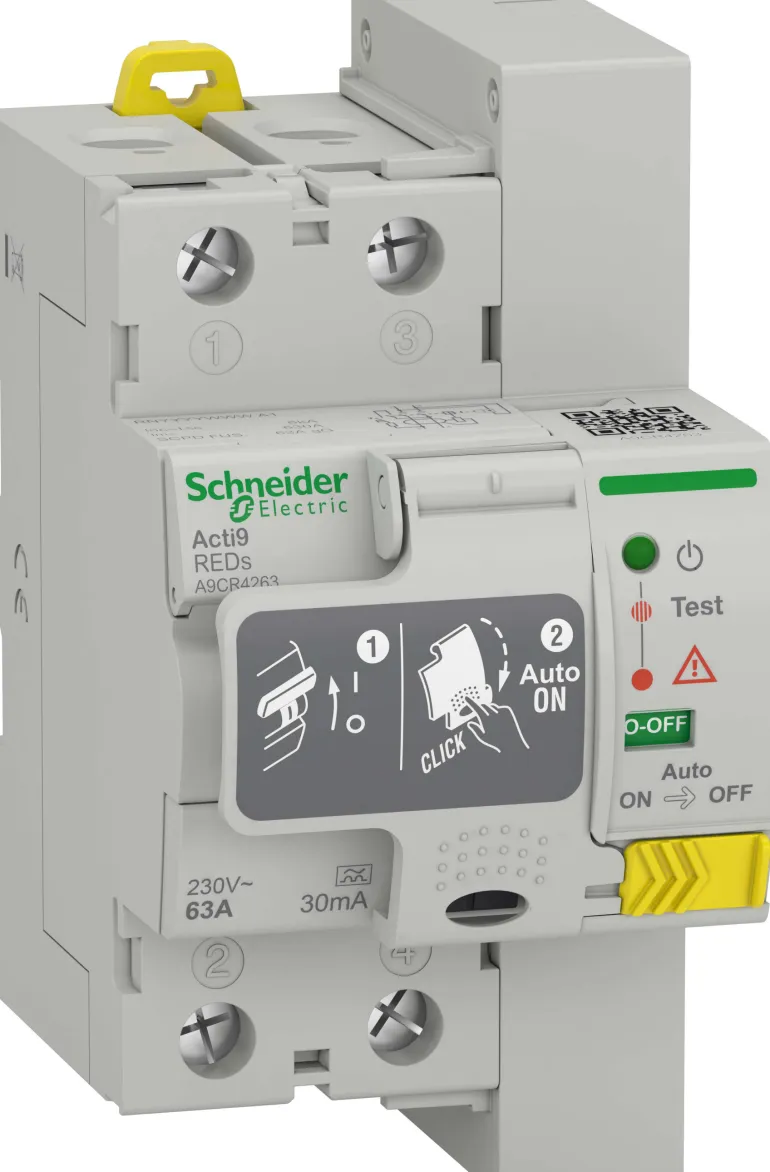 Schneider Electric Acti9 REDs on 2-napainen luokan A vikavirtasuoja, jonka nimellinen vikavirta on 40A, 30mA. Tekee 3 peräkkäistä nollausyritystä ja tarkistaa sitten 15 minuutin välein, jatkuuko vikavirta. Kun vikavirta on korjattu, vikavirtasuoja palaa käyttöasentoon.