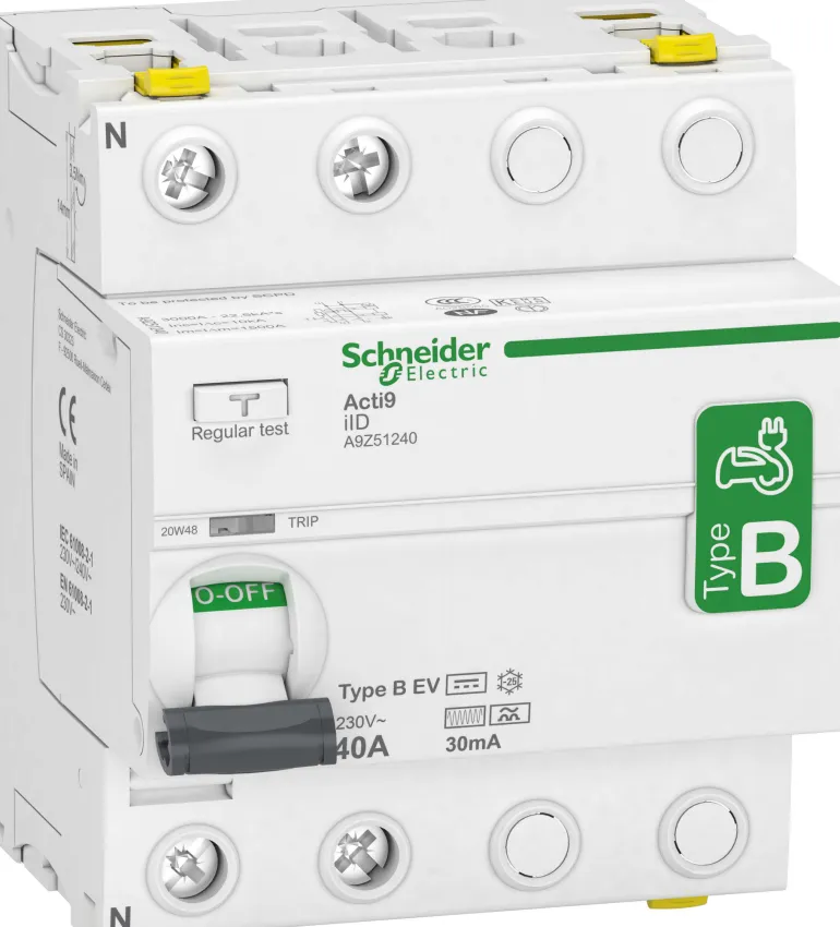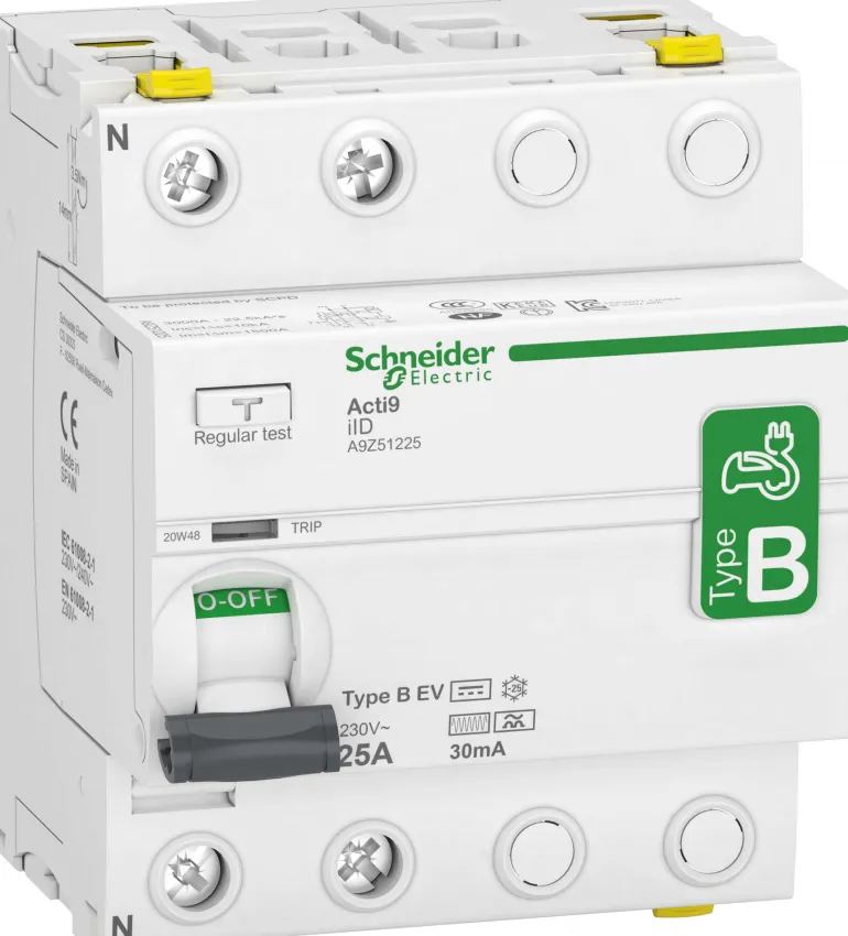 Schneider Electric Acti 9 iID on 2-napainen B-EV-tyyppin vikavirtasuoja, jonka nimellinen vikavirta on 40A, 30mA. Käytetään sovelluksissa, joissa käytetään autolaturia, koska tasavirtaa voi esiintyä. B-EV tarkoittaa sähköautoa ja se on kehitetty erityisesti sähköautojen lataamista varten. Jos sähköauton laturissa ei ole sisäänrakennettua tasavirtasuojaa, se on suojattava B-tyypin vikavirtasuojalla. Nimellisjännite 230 V, 50 Hz. Standardit: IEC/EN 61008-2-1, IEC/EN 62423, IEC 61543, VDE 0664.