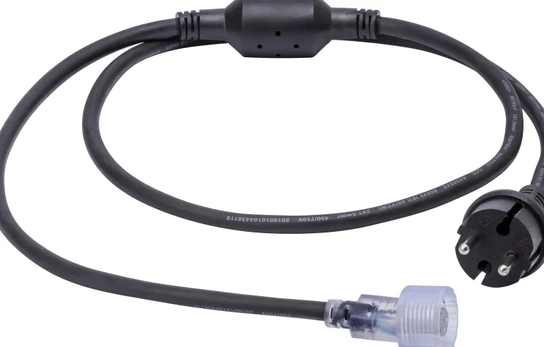 Virtakaapeli muuntajalla 230 V ja pistokeliitäntä Gelia ROPE Worklight -LED-valonauhaan. Pituus 1,5 metriä.