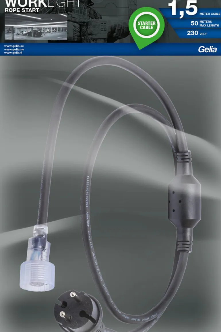 Virtakaapeli muuntajalla 230 V ja pistokeliitäntä Gelia ROPE Worklight -LED-valonauhaan. Pituus 1,5 metriä. Muuntaja on yhteensopiva 50 metrin LED-valonauhan kanssa.