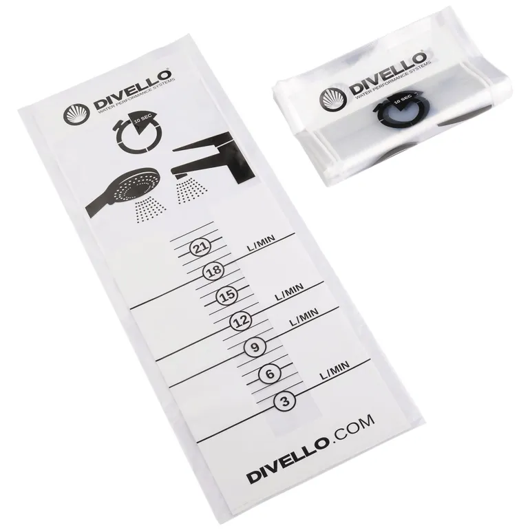 DIVELLOn virtausmittaripussi keittiön, pesualtaan tai suihkun vesipisteiden vedenvirtauksen mittaamiseen. Mittaa vesipisteen virtaus litroina minuutissa laskemalla pussiin vettä 10 sekunnin ajan.