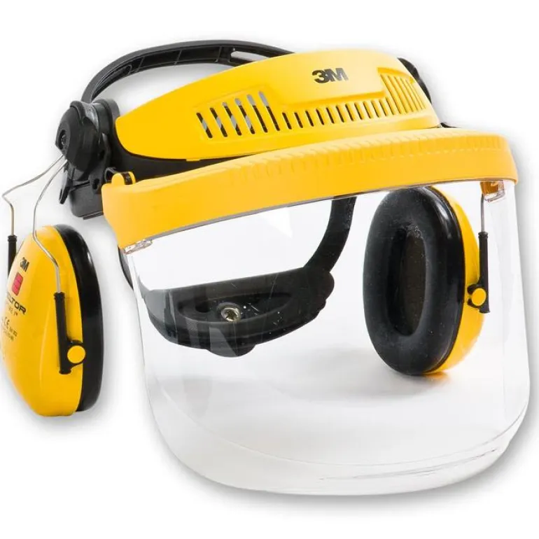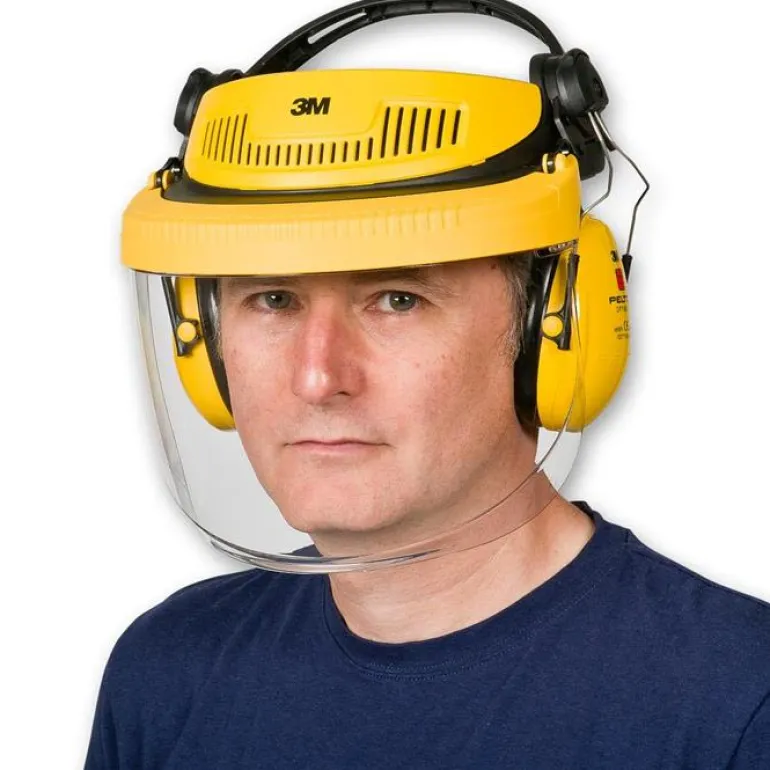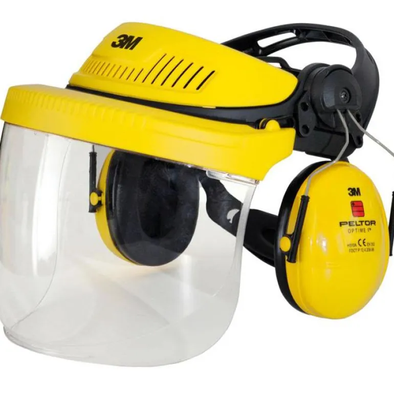 Visiiriyhdistelmä teolliseen käyttöön. Sisältää pidikkeen, kirkkaan polykarbonaattivisiirin ja Peltor Optime 1 -kuulosuojaimet.