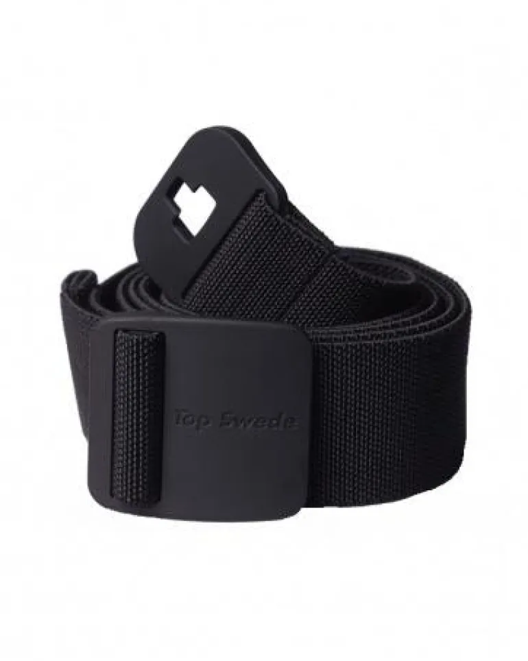 Joustava vyö, jossa on metalliton kumipinnoitettu solki, joka ei naarmuta. Valmistettu 90 % polyesteristä ja 10 % elastaanista, säädettävä pituus.