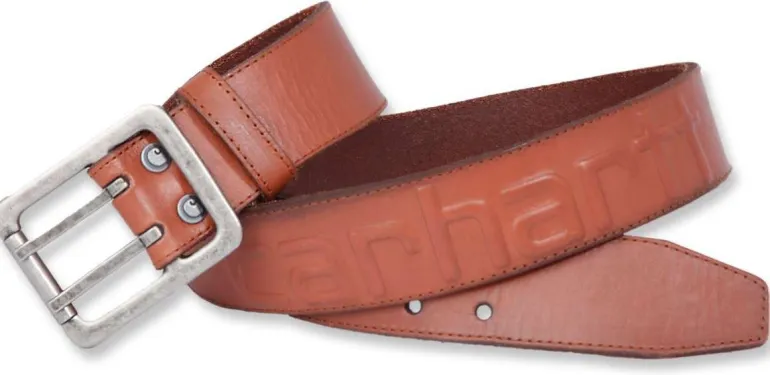 Miesten nahkavyö, jossa kohokuvioitu Carhartt-teksti.