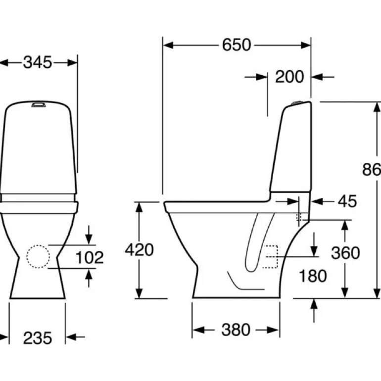 Lattialla seisova wc vakiokannella. Mitat: 860 x 345 x 650 mm (K x L x S), istumakorkeus: 420 mm. Voidaan asentaa kulman ja varustaa käsinojilla, cere-istuinkannella ja korotusjalalla. P-lukkoa voidaan käyttää poistoputken liittämiseen lattiaan, suoraan seinään tai sivuille missä tahansa kulmassa.