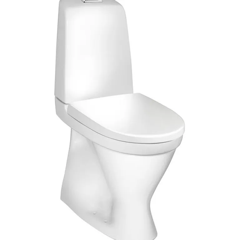 Valkoinen lattialla seisova wc-istuin pehmeästi sulkeutuvalla kannella, sopii kulma-asennukseen. Korkea malli, jonka mitat: 900 x 345 x 650 mm (K x L x S), erityisen korkea istuin: 460 mm. Säädettävä huuhtelumäärä jopa 6 l asti. S-lukko lattiaan kiinnittämistä varten neljällä ruuvilla tai liimaamalla.
