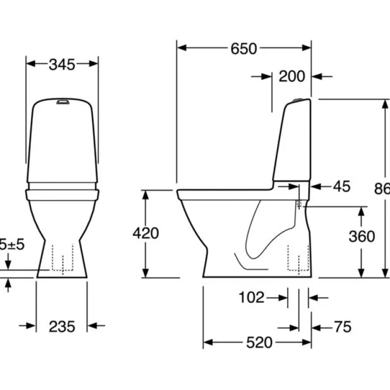 Lattialla seisova wc vakiokannella. Minimalistinen muotoilu, helppo pitää puhtaana ja voidaan asentaa kulmaan. Tehdasasetuksena yksitoiminen huuhtelu 4 l, mutta huuhtelumäärää voi säätää jopa 6 litraan asti. Istumakorkeus 420 mm.