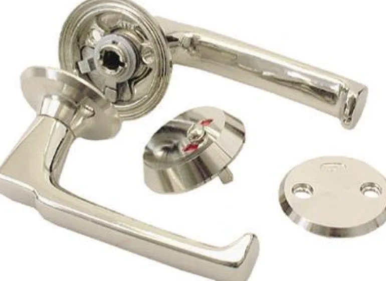 Esteettömään tilaan sopiva WC-lisävaruste oikeakätisenä versiona, joka koostuu kahvasta ja levyistä. Kahva korvaa oven sisäpuolella olevan nupin ja avaa lukon myös normaalilla alaspäin suuntautuvalla liikkeellä.