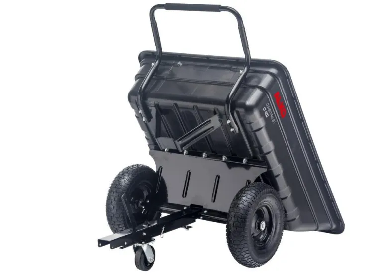 Käytännöllinen puutarhavaunu traktorilla vetoon. Vaunussa on suuret raskaat pyörät ja se kestää jopa 400 kg kuormitukset. Kippitoiminto ja kahva vetämiseen käsin kuin kottikärryissä.