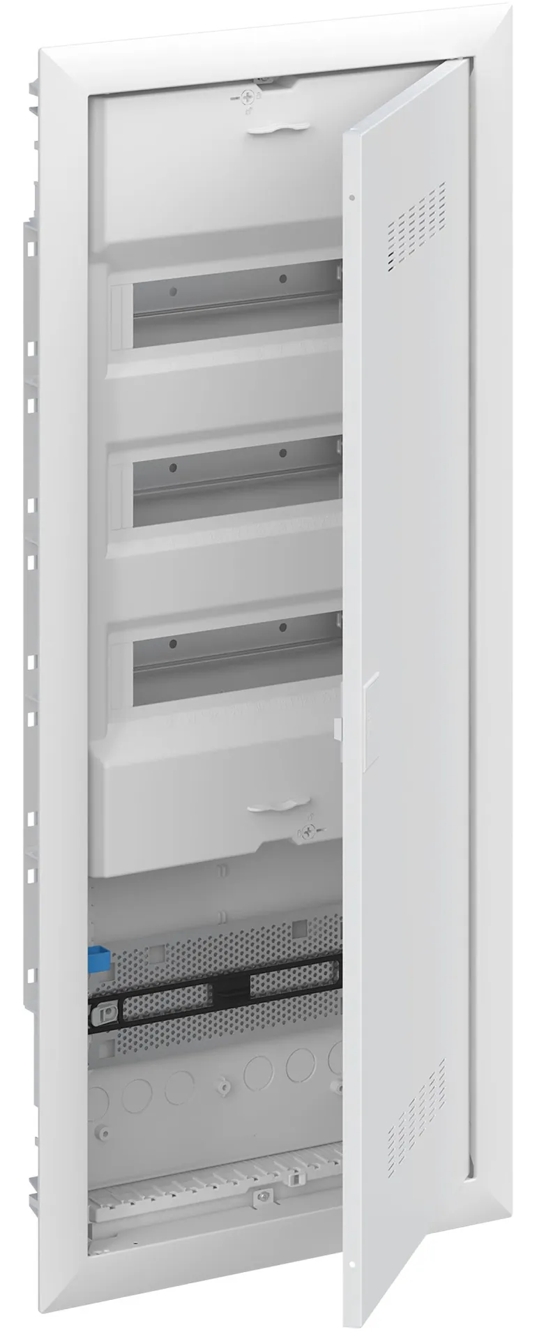 Yhdistelmäkeskus uppoasennukseen, sarjaan ABB UK600, ovikehys ja ilmastoitu ovi. Kotelointiluokka II (kaksoiseristetty), IP30 ja sovellettavat standardit: EN 60670-24, IK-koodi 07.