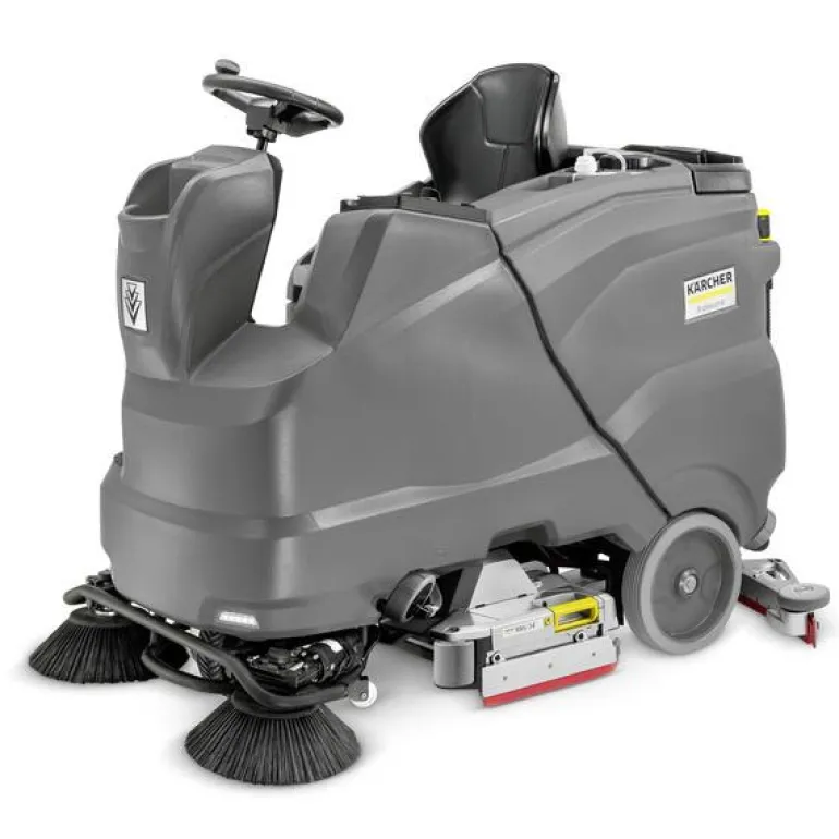 Kärcher B 150 R on yhdistelmäkone, jonka suuri työleveys mahdollistaa suurten pinta-alojen puhdistamisen turvallisesti ja tehokkaasti. Telaharjoilla toimiva R85-pesupää (työleveys 85 cm).